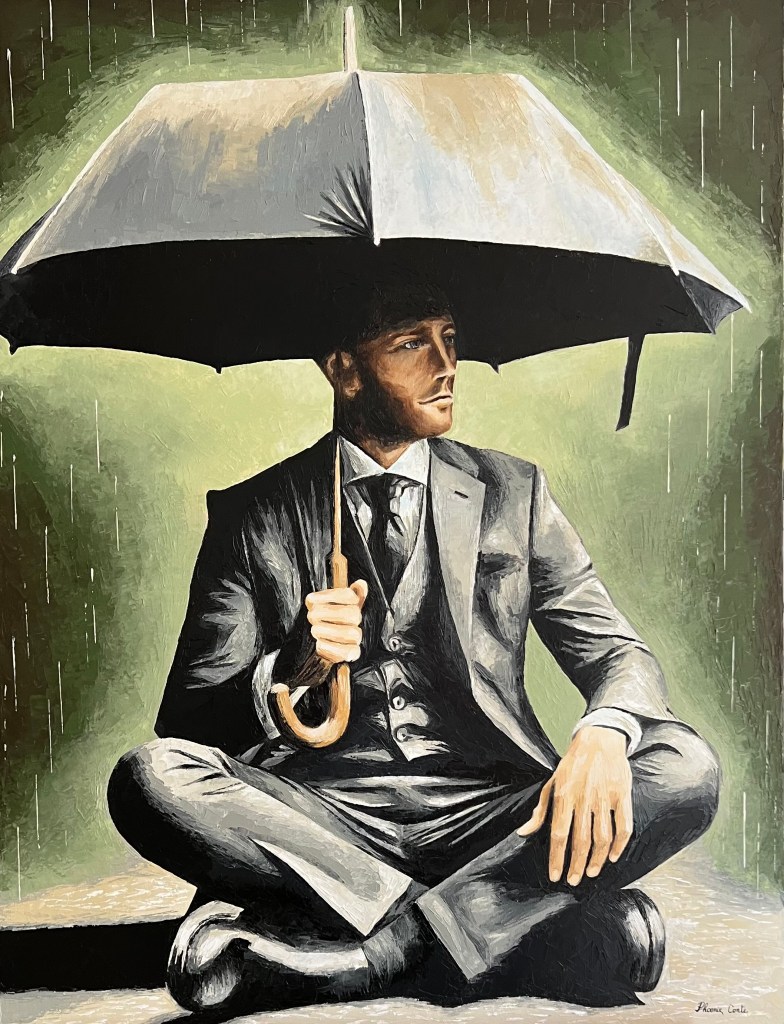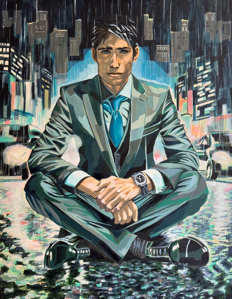 Sous la pluie battante et les lumières froides de la nuit, un homme assis accepte les contraintes qui l’entourent. Non couvert, encerclé par les voitures, il ne lutte pas contre l’inévitable : il puise en lui les ressources pour l’habiter pleinement. Time to Cover dit que l’on peut choisir de voir le chaos comme un fardeau ou comme une source d’émerveillement. Il célèbre la force intérieure.